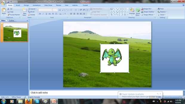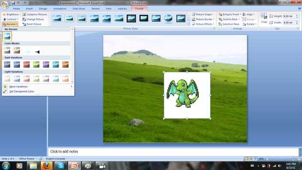 Copiar los sprites en PowerPoint. P: pero hay blanco todo alrededor de él! R: en 2003, es muy simple. Haga clic derecho en el sprite. Habrá un cuadro que aparece. Haga clic en el cuentagotas cosita y haga clic en el blanco en tu sprite. Pluma de. Ido. En 2007, es un poco más difícil. Te voy a mostrar. PRO TIP: Añadir un color que el sprite no tiene en él (que no sea negro, blanco o gris) y hacerlo. Esto evita que todos los blancos en el sprite va transparente.