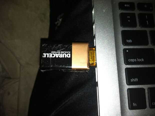 Básicamente destruyó una batería de 9v y pegado en un pendrive.  Todo esto tomó cerca de 10 minutos tops.