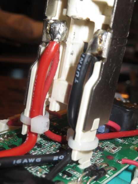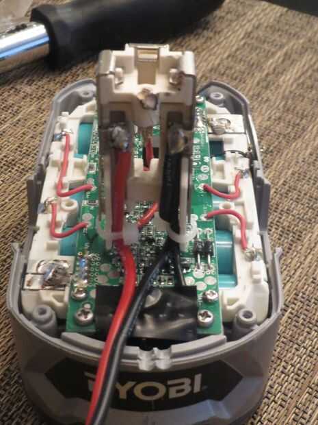 La batería Ryobi tiene cables 18awg provenientes de la placa de circuito para los contactos. He añadido el cable 16awg para mi modificación. Me imagino que si es seguro para la longitud stock 18awg, usando 16awg para mi extensión corta debe ser adecuada. También he añadido un trozo de cinta aislante para proteger los cables desde la conexión de la Junta. También he añadido una ziptie para cada cepa de quitar cable de las conexiones soldadas.