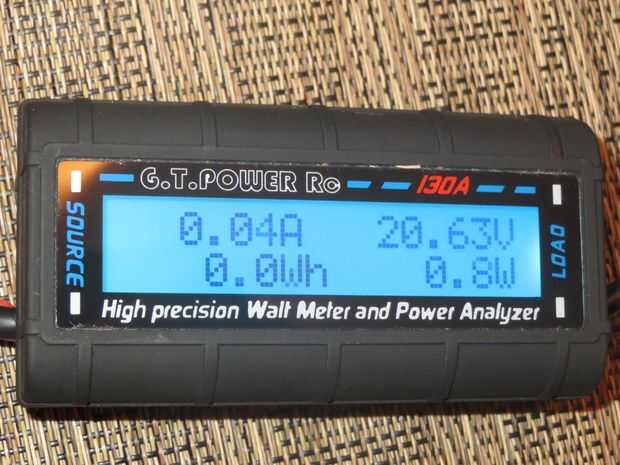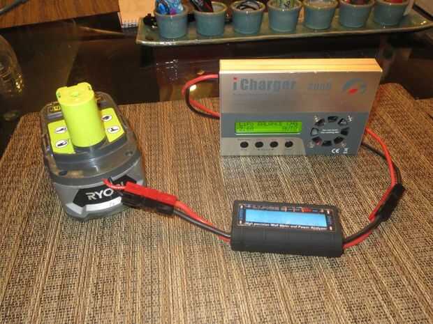 En la primera foto tengo la batería conectada a mi medidor de potencia y está conectado con el cargador de mi hobby. La batería Ryobi está impulsando todo.