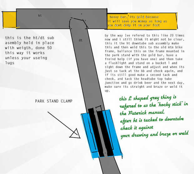Mecánico en una tienda de bicicletas local explicaba una vez a mí por qué Santana tándem marcos son los marcos de acero más extensos en el complejo industrial de ciclismo. Él dijo algo acerca de cómo cualquier error inglete se magnificó a distancia y las tolerancias en tándem fueron la mitad de los de un individual, o algunos tal absurdo. Supongo que pensaba que añadiendo un tubo a una Asamblea fue como un velero en el océano hace 400 años, y un grado o dos y usted pierda su destino por cientos de millas y no encontrar tierra ni oro y ser ser keelhauled por su sed y hambre tripulación de amotinados. Bien su solo la mitad que malo, cintas métricas son tan inexactos a 50cm como a 150. y si su tubo de dirección es hacia fuera de incluso un grado solo se mostrarán en su cinta de medir como el recalentamiento de las barras de combustible en una película de submarinos. Así que una buena cinta métrica y utilizar el mismo para todo el proyecto, constantemente usted comparar modelo físico para el dibujo a uno que ha realizado. Antes vira el hocky palo al resto de la comprobación de la bicicleta la medida entre el centro de la ensambladura de st/tt y el cruce de HT/DT.