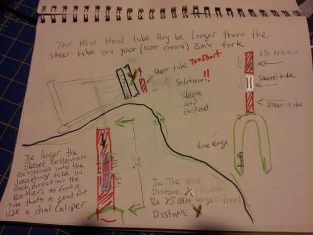 Si el buey de los tubos a corto es nada preocuparse, vas a encontrar dos tubos más para cuidar de esto, un tubo que mangas firmemente en la tapa del tubo de dirección de bmx horquillas exististing, luego vas a la manga anouther pedazo de tubo de 1-1/8 od sobre cuál es la izquierda sobresale la segunda pieza. Perfore unos agujeros en el tubo de dirección y el exstention antes de comenzar en todo esto. Si los ajustes están bien apretados en estos no necesita hacer cualquier trabajo de lujo alignhnent, si vas a necesitar para todos juntos besure usted cubrir el entero con fundente de bronce antes de armarlo. Si no son sólo agarrar un pedazo de ángulo y abrazadera todo abajo en la esquina, ahora agarra una antorcha y unas cañas y llenar todo con latón o carfully tig la brecha y tapar los agujeros que ha perforado con soldadura de tapón.