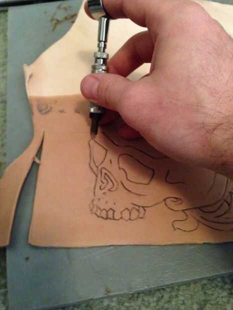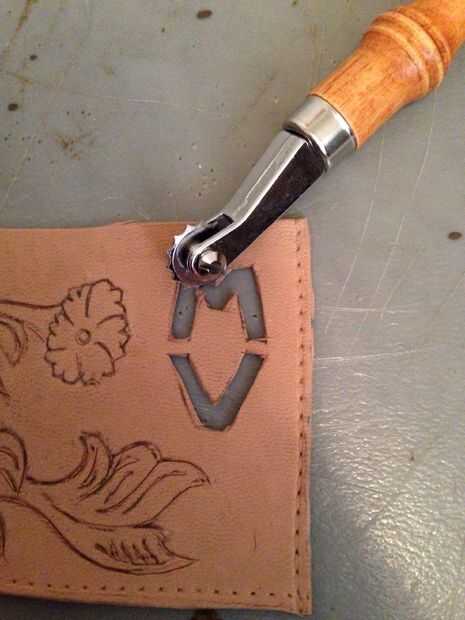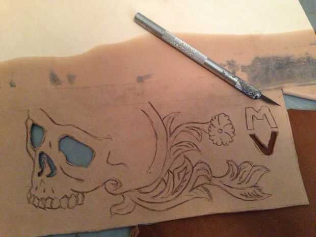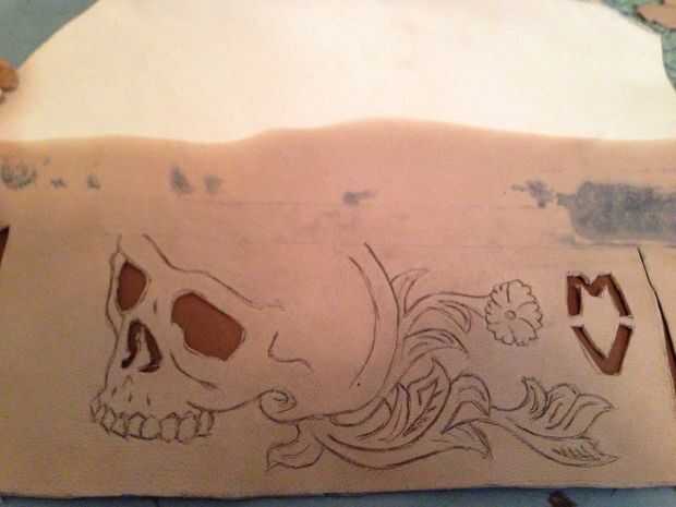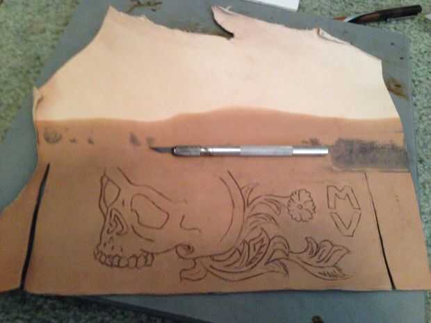 Después de tener la imagen en la piel, utilice su cuchillo escultura para trazar esas líneas, a una profundidad normal (no a través). (Paso opcional) A continuación tome el cuchillo del Exacto y cortar los ojos, nariz y monograma las letras. Utilice una rueda de costura y trazar los bordes, como se ve en el patrón. Esto le permitirá sabes dónde perforar agujero con el punzón, hacer esto para todos los pedazos. Utilice un perforador de cuero en las esquinas donde se instalará el remache.