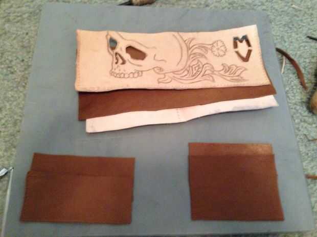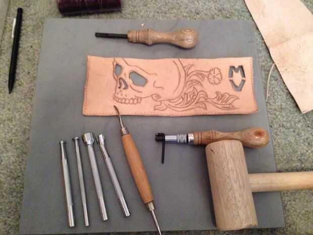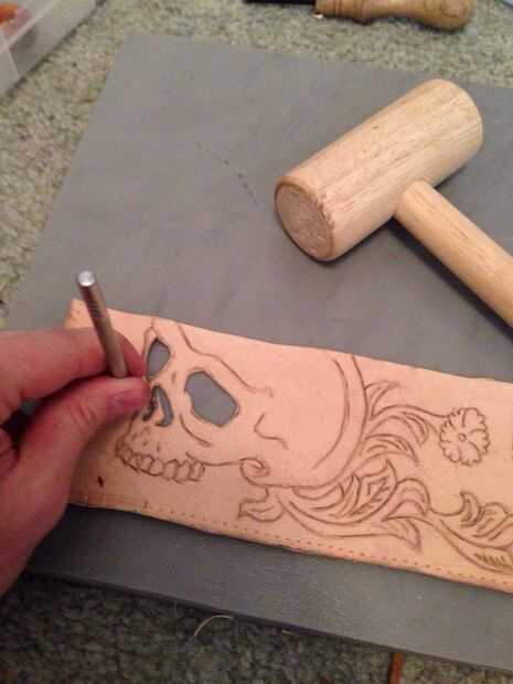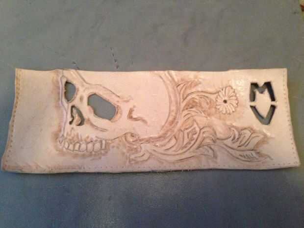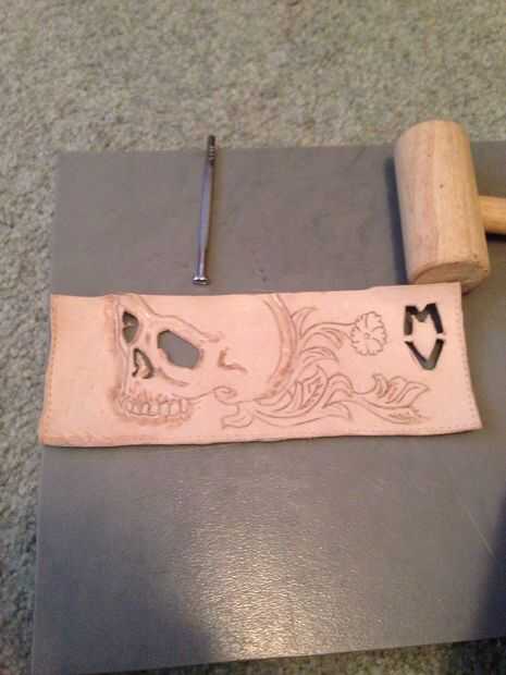 En este paso iremos añadiendo textura y profundidad de la piel. Cuando el cuero se haya secado, utilice una herramienta mazo y biselado, libra las zonas alrededor del exterior del cráneo. Lo mismo para otras áreas debajo de los ojos y alrededor del perímetro de las flores. Puede añadir cierta textura realmente por encima de los dientes y en las venas del diseño floral. Bastante, cualquier cosa que desea mostrar una curva o retratar profundidad, bisel. también se puede jugar con otras herramientas que tengas, mis herramientas son algunos qué limitadas.