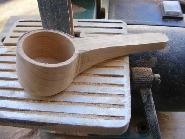 Una vez que han cortado la forma áspera de la cuchara, tomar a la lijadora y arena a la forma final. Podría utilizar un tambor de lijado y coloque en el taladro o use una lijadora de banda. Utilicé una lijadora de banda de 1 pulgada. También se podría utilizar una Dremel. ¿No tiene alguna de estas herramientas? Entonces usted podría siempre tallarlo a la forma final.