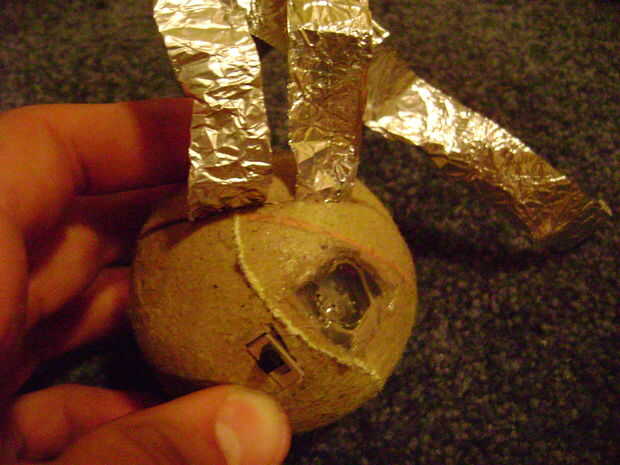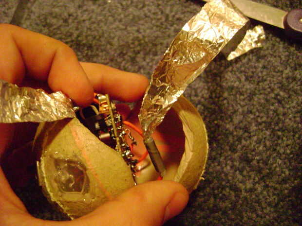 Envuelva las tiras de papel de aluminio alrededor de la bola de cualquier manera que usted por favor y caliente pegamento en su lugar. Es importante que ellos no toquen o no funcionará. Mina está muy descuidado pero funciona.