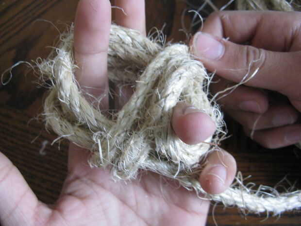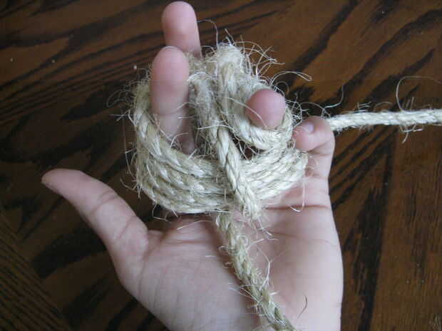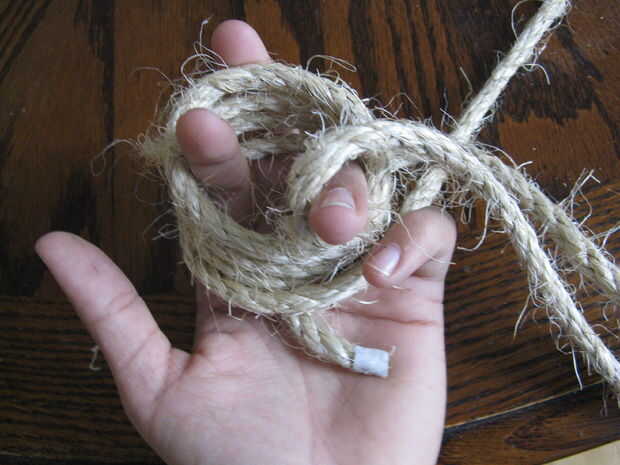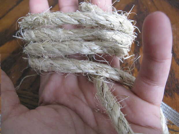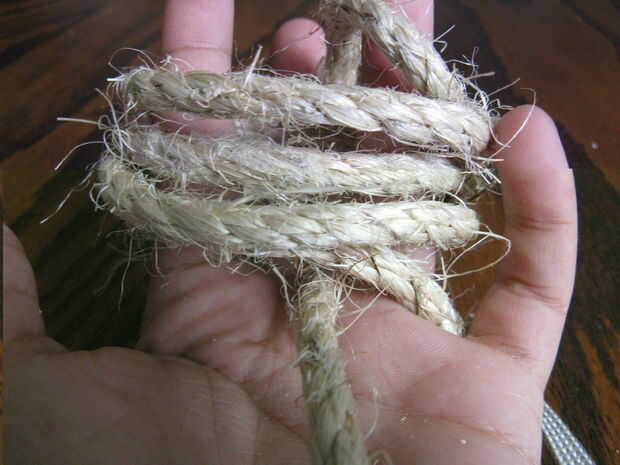 1.3 después de haber envuelto la cuerda alrededor de su dedo anular, envuelva la cuerda alrededor de la anterior envoltura (ver fotos) repetir esto hasta que tengas cinco anillos allí también. ¡ Pero espere! Al llegar dos o tres vueltas, introducir el peso.