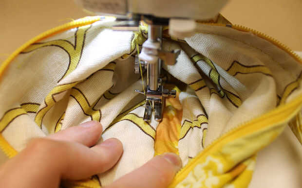 Suavizar los bordes y girar a la doblez en los bordes dejaste deshecho para convertir su bolsa de adentro hacia afuera. Puede hacer una puntada corta o siga el borde entero de la bolsa para darle más estructura. Repetir en ambos lados.