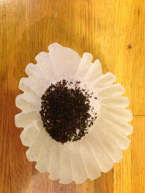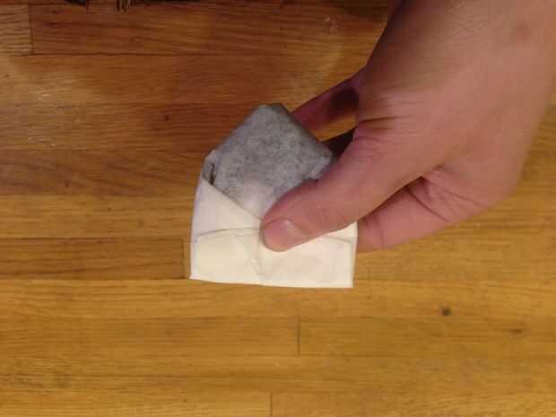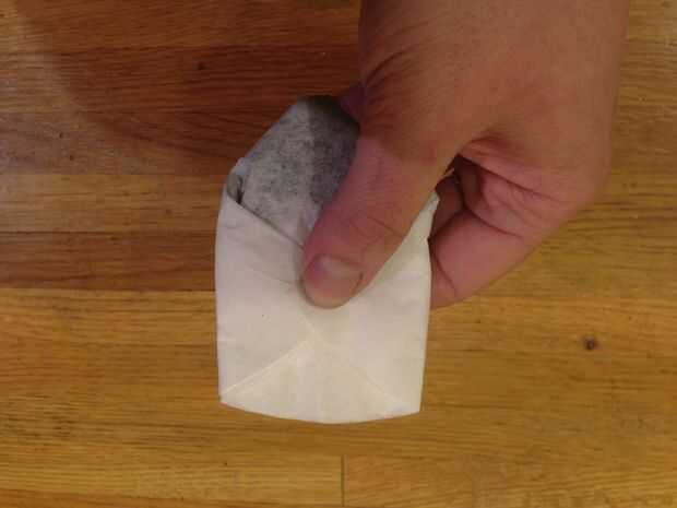 Añadí té al filtro y luego lo dobla en una bolsa pequeña. Mis imágenes como guía de referencia.