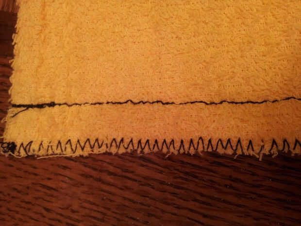 - Alinee la aguja de máquina de coser a lo largo del extremo deshilachado de la toalla.- Al coser una puntada en zigzag, la aguja debe aterrizar apenas fuera del borde deshilachado cada otra vez puntadas hacia abajo, como se ve arriba.
