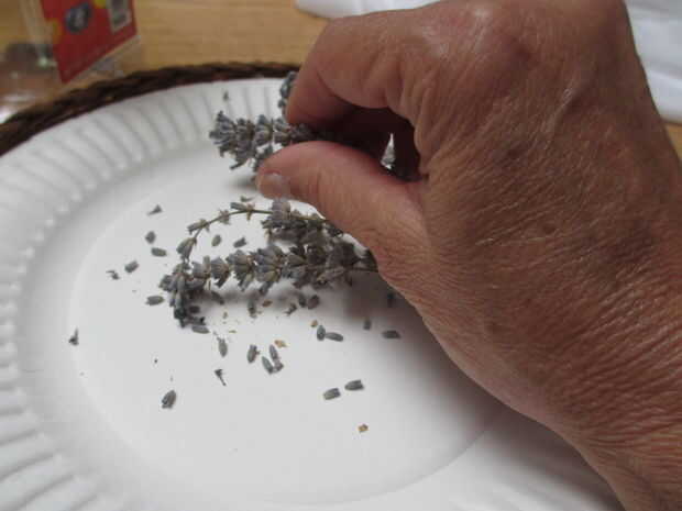 Una vez que se han secado (se puede sentir que las flores ya no son suaves y esponjosas) Deslice el pulgar y el dedo índice hacia abajo de los tallos para despojarlos de las flores. (Yo a veces tirar los tallos en el suelo para aspirar - poner el olor en mi vacío) Toda la habitación olor a lavanda, así que si hay alguien en tu casa que no le gusta el olor - hacerlo fuera.