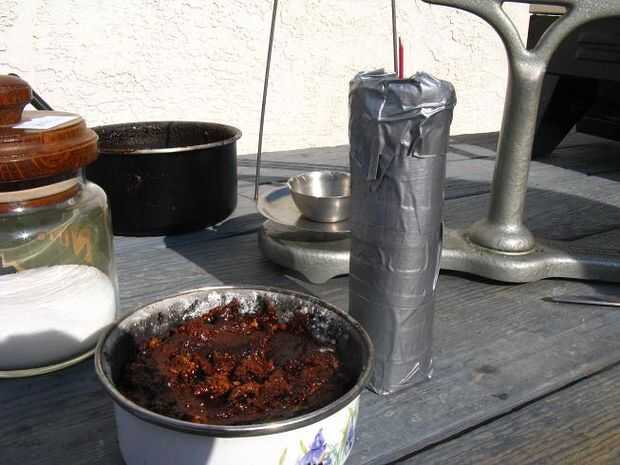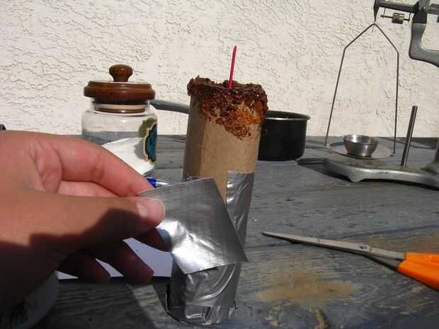 Cubrir completamente la parte inferior de la carcasa envolviendo con cinta adhesiva. Comenzar a rellenar la cubierta con mayor cantidad de la mezcla como puedas. Una vez que se llena, pegar una pluma en la parte superior de la mezcla para crear una pequeña cueva en la mezcla para el fusible. Comenzar a envolver el resto de la vivienda en la cinta del conducto. Como usted comienza a envolver la parte superior, retire la pluma e inserte el fusible.