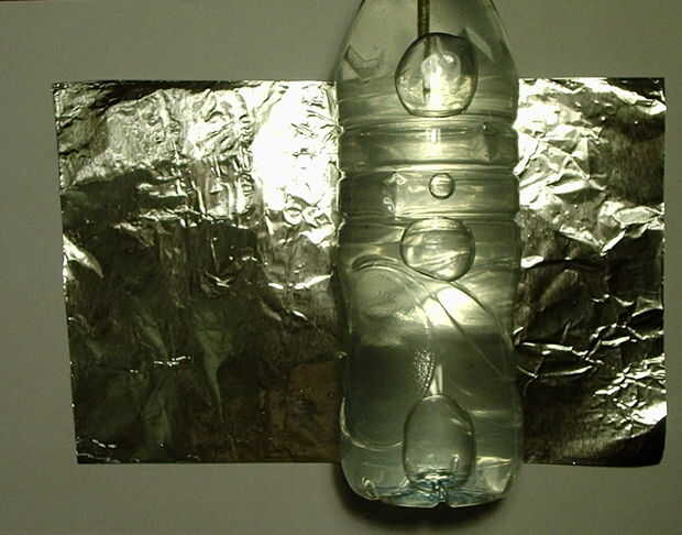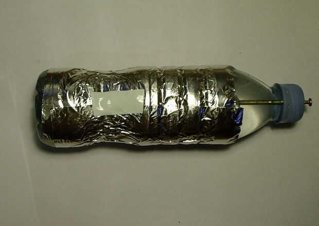 Usted puede utilizar algo mucho mucho mejor que el papel de aluminio si tiene, utilice cinta de aluminio. Puede simplemente cinta adhesiva alrededor de la botella y no tienen dificultades para envolver la botella con papel y cinta (o pegamento).