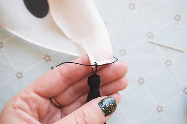 Hilo los hilos superiores de las borlas en las curvas de su bufanda, anude los hilos y pinza los extremos extras fuera. ¡ Listo!