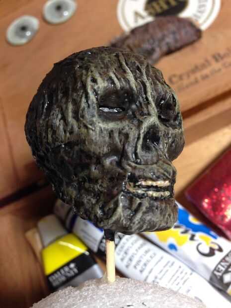 Después de prueba de ajuste de la altura de la pantalla final de la cabeza, corte el otro extremo de la brocheta y colocar en su pantalla. Asegurar con pegamento caliente. La base se puede hacer de espuma, madera o lo que tengas que poner alrededor. Asegúrese de que su base está terminada. Es difícil trabajar en la base con la cabeza que se le atribuye. Añadir una etiqueta antigua a su base (ver MonsterTutorials.com de antigüedades las etiquetas y más tutoriales).
