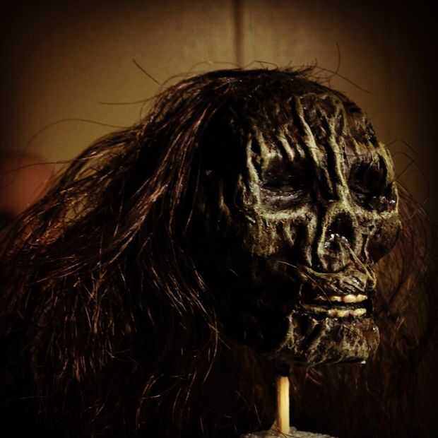 A partir de la sombra más oscura (y hace referencia a imágenes de cabezas encogidas reales), cepillo sobre toda la cabeza, generosamente, pero con el pincel un poco seco. Esto pinta la cabeza completamente, sino dejar la pintura de látex negra visible en los más profundo huecos y hendiduras. Utilicé una combinación de marrón oscuro, con un pequeño toque de azul y verde.