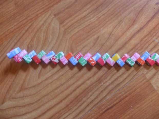 usted puede hacer fácilmente una cadena de contenedores starburst o goma de mascar. Estoy usando envolturas starburst desde hoy comí algunos, pero goma envolturas trabajo igual de bien.Acabo de hacer una cadena de un paquete de destellos, pero si tie