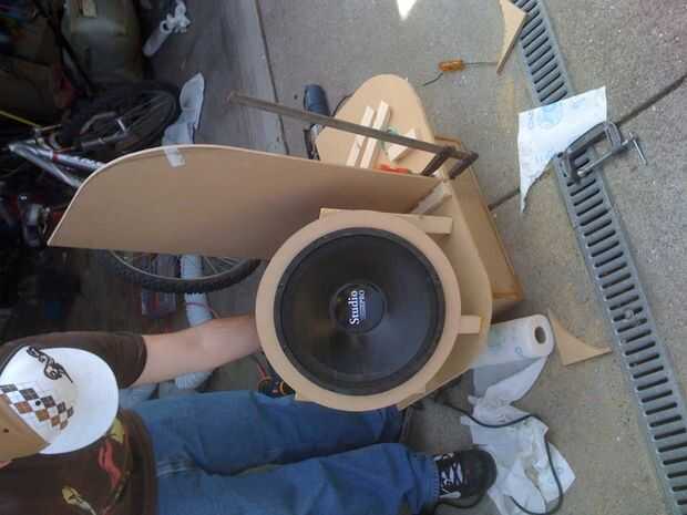 Como se puede ver en la segunda foto tenemos que cortar un anillo que sería allí para asegurarse de que la sub 15" cabrían. Tuve que usar un clavo y un trozo de cuerda para hacer el anillo de un tamaño aproximado. Corto hacia fuera y archivado/lijar hasta que el altavoz sentó en apretado. Utilizamos postes para sostener el anillo del altavoz fueron queremos que sea en el diseño final. Los otros oradores nos hizo lo mismo cortando anillos para adaptarse a los demás oradores y tenía suspendido por los postes. Los marcos de los altavoces tienen que ser con capacidades para soportar el peso de la estirada de poliéster. Luego agregamos un nuevo a la caja porque queríamos sea plana. Usted debe atar con alambre ahora dependiendo de cómo muchos oradores o cuánto acceso tiene al interior de la caja después.