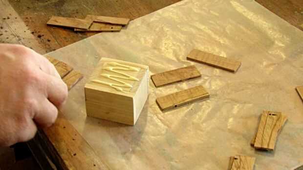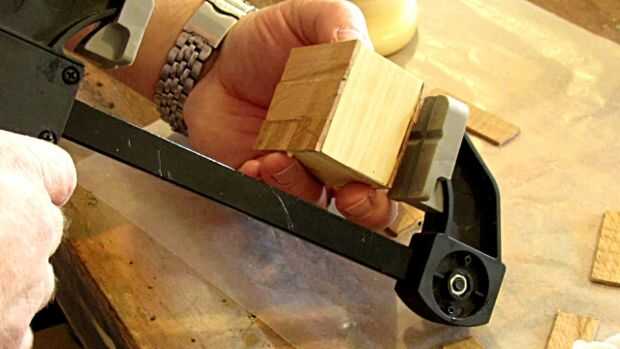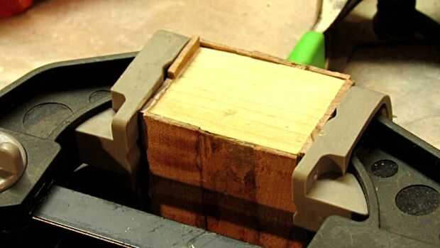 Después de que el pegamento esté seco y se cortaron las tiras delgadas. Probé cuidadosamente para que coincida con los patrones de grano en cada tira para el mejor aspecto posible. Después de elegir el patrón, comencé a pegar hasta los primeros 2 lados superior e inferior y luego amarre.