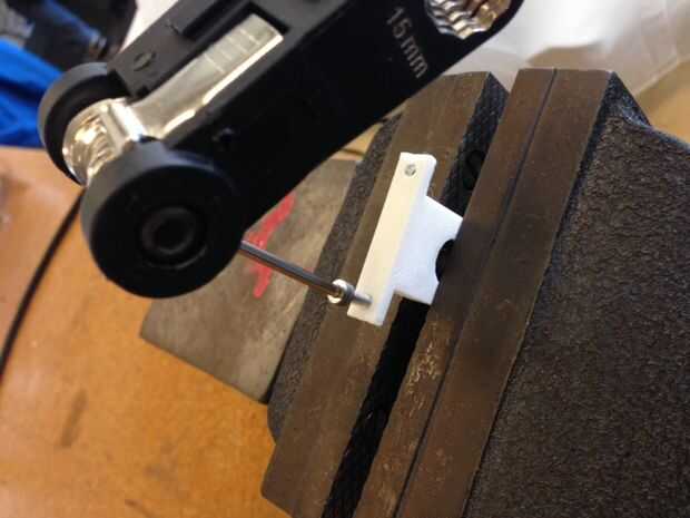 Mi diseño incluye dos agujeros de fijación, por lo que puedo colocar en cualquier lugar con la tuerca y el perno pero también un hilo de rosca del taladro y eliminar la necesidad de tuerca. Es bastante fácil, que no necesita una herramienta especial ya que el material es plástico. Montar la pieza a una pinza y tratar de apriete el perno con una fuerza hacia abajo. Después de se dedica, gire el perno CW y CCW varias veces.