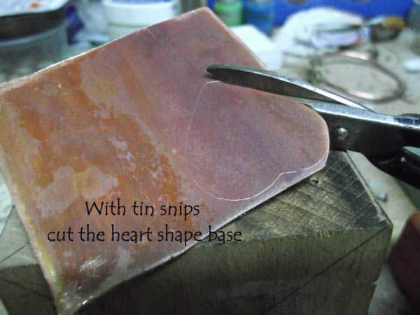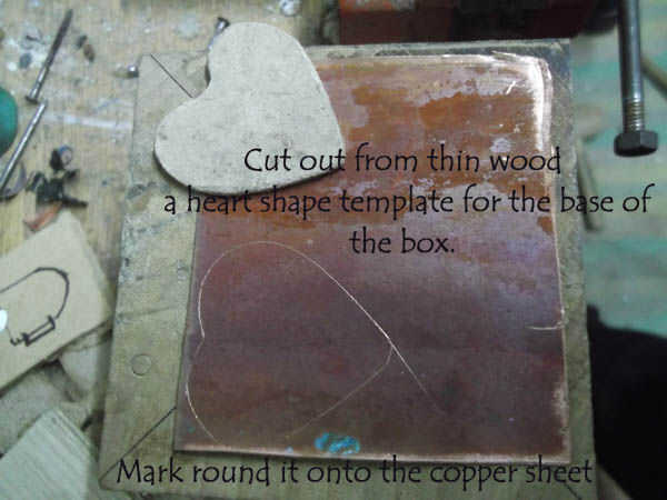 De fina madera o MDF, corte una plantilla de corazón del tamaño de la base de la caja. Este es 3 x 3 cm. Esto marca en la hoja de cobre utilizando un archivo o escriba sharp. Con tinsnips cortar la forma de cobre, limpiar con papel de lija y flattern hacia fuera cualquier golpes sobre una superficie plana con un martillo.