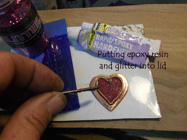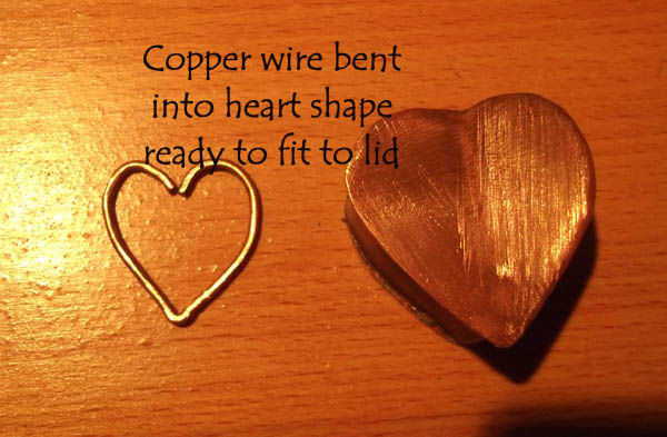 La cubierta de un alambre de cobre y doblar la tira en forma de corazón que es más pequeña que la tapa. Coloque en una superficie plana y golpee con un martillo para asegurarse de que se sientan sobre la tapa. Hacer que el alambre y la tapa estén limpias y libre de grasa, mezclan algunos epoxi en un pedazo de tarjeta y espolvorear un poco de brillo al lado del de epoxy. Usted puede Agregar un poquito de pintura acrílica también la mezcla de un rojo más oscuro, coloque el corazón de alambre sobre la tapa y añada lentamente el epoxi en el interior de la forma del corazón (Asegúrese de que su mezcla bien o no establecer duro) utilizo epoxy de 5 minutos de la tienda de hardware. Cuando se establece duras de que llegar una agradable superficie brillante como esmalte, Ive encontró su mejor servicio limpieza la tapa antes de poner en el esmalte como algunas ruedas de pulido pueden dañar la superficie del esmalte. Archivo de cualquier bit de cobre alrededor de la caja por lo que parece ordenado, utilizando una dremel o una rueda de pulir Limpie y Pula dentro y por fuera y listo.