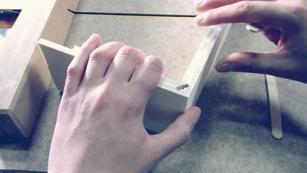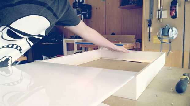 Ahora podemos pegar los 4 lados con las ranuras ocultas y una abrazadera de marco de foto realmente ayuda. Asegúrese de que todo es cuadrado y que la hoja de acrílico se asienta muy bien en su barbilla.