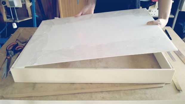 No olvides que un trozo de la frontera deben ser más gruesas para que coincida con la altura final de la caja de luz (recordar en el paso 1 cuando hablé acerca de mi error en el video?). Es la pieza que no se pega y poder salir si usted necesita quitar o reemplazar la hoja de acrílico.