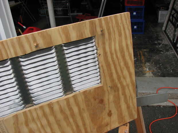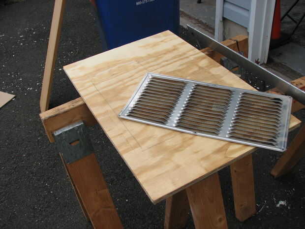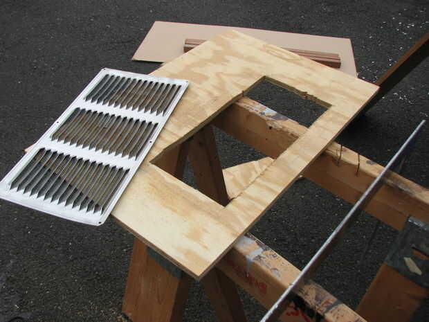 Cortar piezas de madera según el diseño. He utilizado tres de ventilación tipo persiana prefabricados (vendida en Lowes y Home Depot por $1.50 un pedazo). Que corte las ranuras en la madera contrachapada que equivale a la zona abierta de las rejillas de ventilación. Para cortar las ranuras, he marcado el área rectangular a cortar primero. Hice cuatro orificios con una dremel dentro del límite de cada línea del rectángulo. Usé la sierra caladora para cortar directamente en las líneas previamente marcadas para obtener un rectángulo decente. Sujeta la rejilla de ventilación a la madera usando los tornillos 1/2".
