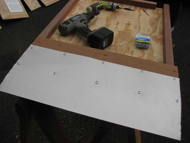 La parte trasera es más pequeña que el resto de los paneles ya que utiliza en el lado de escape y quería que el escape de humos para salir con muy poca obstrucción. Sin embargo, la lluvia seguía siendo una preocupación y como mencioné antes el silenciador se calienta realmente, necesitaba proteger a la madera contrachapada de la quema por el calor. Tuve algunos intermitente hoja puesta alrededor. Me corte un pedazo de hoja ligeramente más grande que la parte trasera y había Unido desde dentro a la madera usando los tornillos 1/4". Tenga en cuenta que destella de aluminio flexible se puede doblar como un pabellón para detener la lluvia y dejar que los gases de escape hacia fuera.