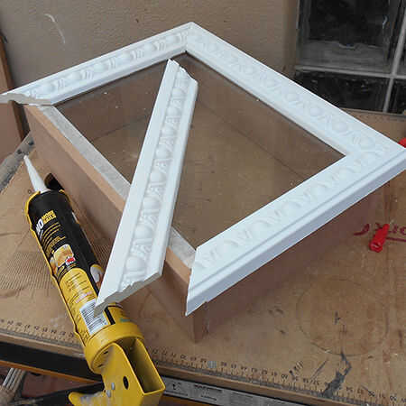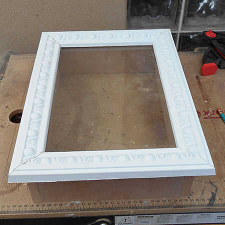 7. pegar el marco frontal aplicando una capa liberal de adhesivo a los bordes superiores de la caja y también a los bordes de la moldura. Presione el marco o moldura firmemente en su lugar asegurándose de que los bordes se unen muy bien entre sí.