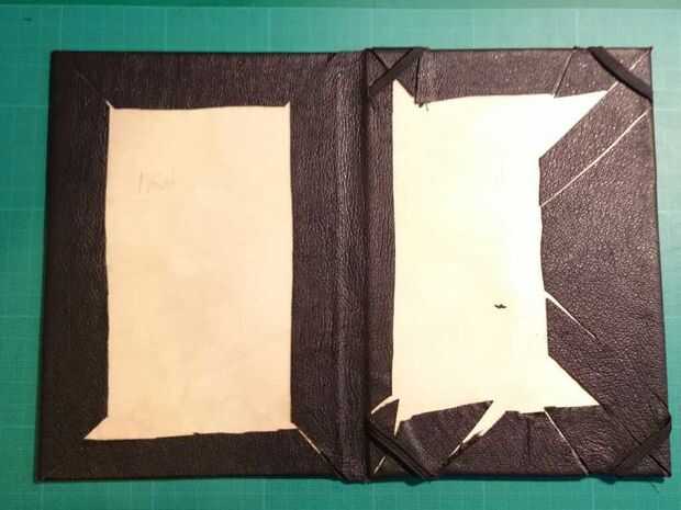 Áspero para arriba los lados brillantes de la piel con papel de lija, luego pegar las hojas finales de cuero en el interior de la tapa, tenga cuidado de pegar hacia abajo los bordes firmemente.
