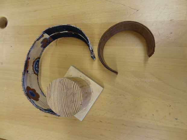 Cortar la chapa que utiliza 1,6 pulgadas (4 cm) 7.9 (18 cm) de largo. Utilicé cuatro piezas cortas chapa pero también puede cortar una tira larga y después de aplicar el pegamento envuélvalo alrededor de una forma sin una correa (ver enlace en el siguiente paso)