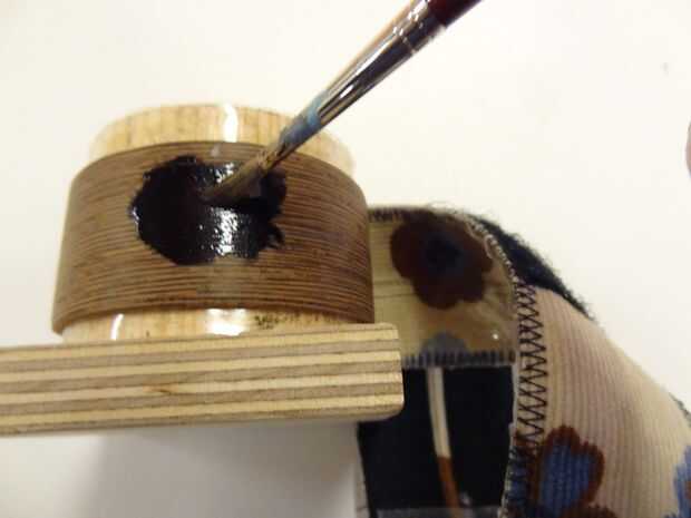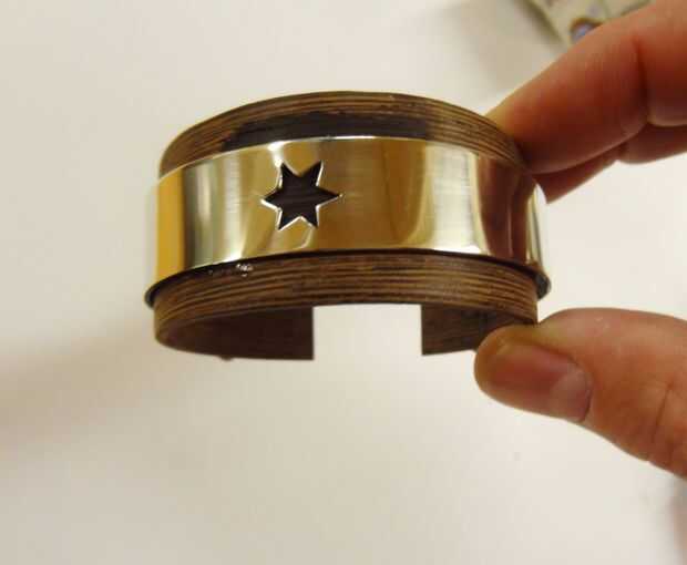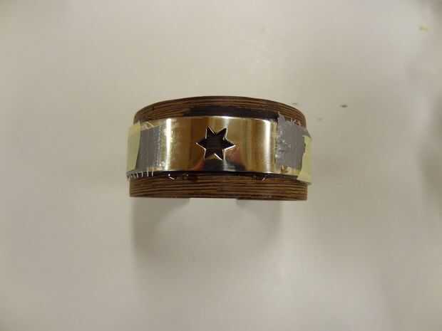 Deslizar la pulsera metálica en la pulsera de madera y presionar el metal pulsera la pulsera de madera con cinta adhesiva.