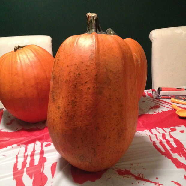 Así que empezar esto puede parecer obvio pero necesita encontrar una calabaza que es más alta que ancha. Elegí uno que es cerca de 14" H x 10" w. Mantenga en mente que cuando termine querrá suficiente espacio interior para poner un par de galones de su bebida favorita. Al escoger la calabaza lo más pesado la calabaza es en comparación con similar tamaño calabazas cuanto más gruesa las paredes y mejor para tallar en.
