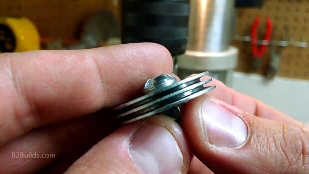 Para montar esto, solía un molino áspero-para arriba el metal en las arandelas para obtener mejor adherencia del epoxy JB Weld que solía pegar juntos. Estos fueron con abrazadera y permite curar durante al menos 24 horas. El epóxico extra "squeeze-out" fue limpiado luego girar el sándwich de la lavadora de mi taladro, y ejecutando un hack del disco en los surcos.