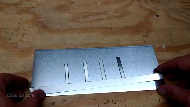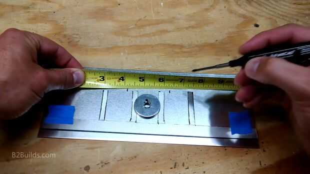 Los dos ojos de la calabaza se conectará a una pieza de metal. Para esto usé una hoja fina de tapajuntas de aluminio (que se encuentra en la sección de material para techos de la tienda). Corte un pedazo largo con cuatro "montantes" que se pega para arriba.