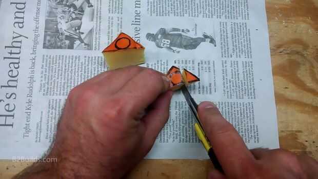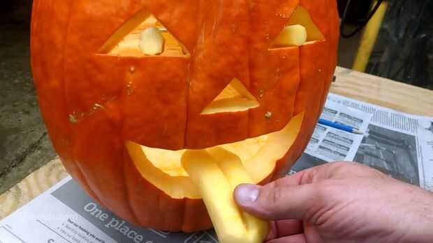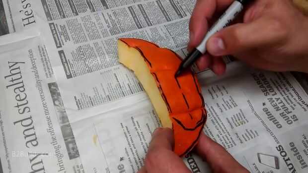 Corte mi diseño con los ojos separados para que coincida con mi mecanismo. También me aseguré cortar una abertura grande en la parte superior de la calabaza (más de forma ovalada, que se extiende hacia la parte posterior) para poder entrar y salir del mecanismo y trabajo interior con ambas manos si es necesario.