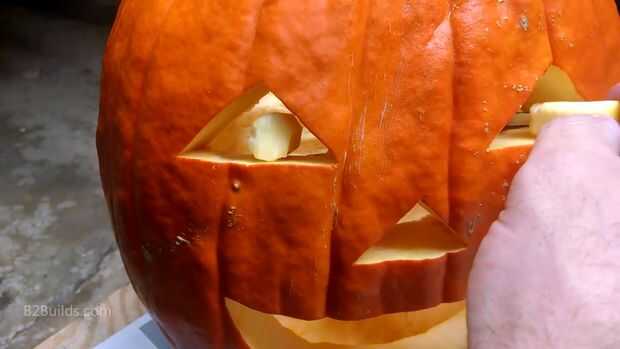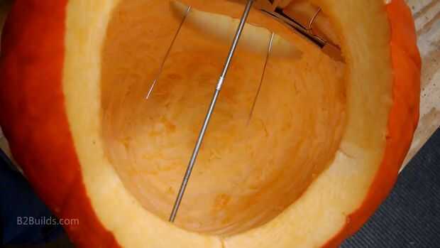 Para montar la lengua he insertado dos cables bastante rígidos en la parte posterior de la lengua. Fueron doblados hacia fuera para se puedan esparcir y mayor estabilidad e inserta en la parte trasera de la calabaza. Esto permitirá que la lengua para mover arriba y abajo y permanecer en la posición en la boca. Separarse los cables apartes también permite que la vela para sentarse más adelante.
