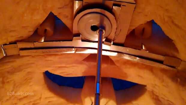 Para solucionar esto, corté un pedazo en forma de u de aluminio del mismo material fino utilizado para los ojos, con el doblado de los extremos hacia arriba para enganchar la línea de pesca (ver foto). Esto funcionó hacia fuera mejor para montaje, podía atar el lazo fuera de la calabaza, poner alrededor de los cables detrás de la lengüeta y levante y en los ganchos. Tomó algún ensayo y error para conseguir el lazo en el tamaño correcto, pero funcionó. Los bordes de la pieza en forma de u eran un poco ásperos de corte así que se quedó atrapado a veces, pero este problema fue después de lijar los bordes lisos.