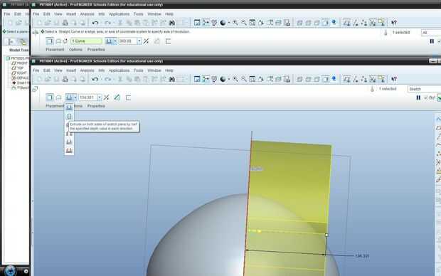 Haga clic en el botón extruir. Esto hará que una protuberancia que sobresale en el sitio del dibujo 2D. Necesitará ajustar esto para que la extrusión sale igualmente de ambos lados. Puede hacer esto seleccionando el menú desplegable de la barra de herramientas de extrusión en la parte superior de la ventana. Haga clic en la segunda opción en el menú desplegable. Esto creará una extrusión igual que estará alineada con el cuerpo de la caldera. Puede ajustar el tamaño de la extrusión haciendo doble clic en la medida que surge de la forma.