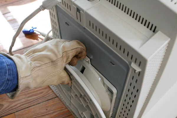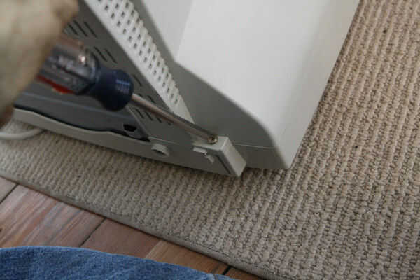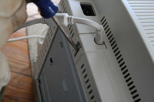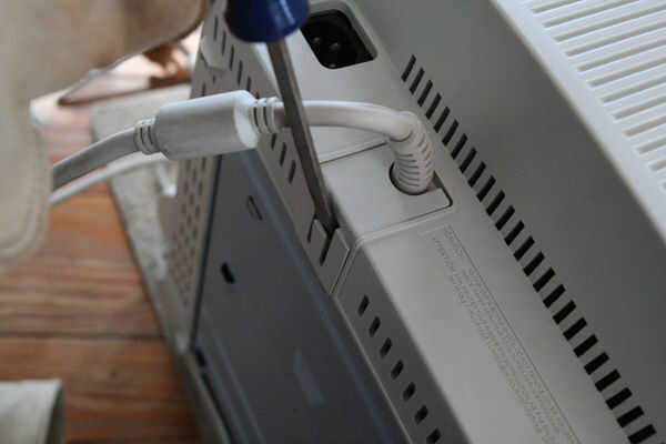 Retire el soporte de la en la parte inferior de la pantalla (su gato no puede apreciar oscilando hacia adelante y hacia atrás). A menudo tienen un truco, una ranura de plástico que tienes que pulsar, y luego se deslizan. Una vez he topado con uno, realmente tenías que girar para sacarlo.