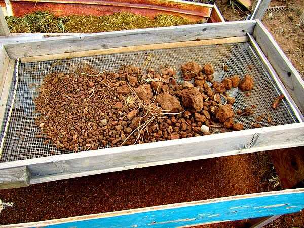 Esto también significa que hay un montón de procesamiento antes de la suciedad vuelve a la cama. Tamizar toda la suciedad que sacó de la cama a través de una pantalla de 1/4" para quitar piedras y romper la arcilla en pedacitos más pequeños. Aproximadamente la mitad de la suciedad que he extraje no califica como gardenworthy y generalmente termina como relleno en algún otro.
