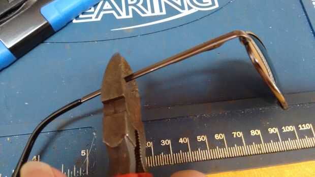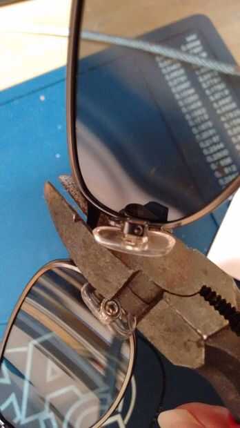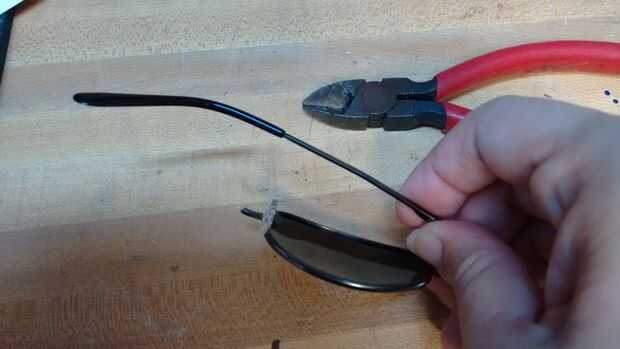 Si utiliza el tipo de fotograma completo, encájelas aparte y también quitar el cojín de la nariz. Esencialmente, usted tendrá un monóculo de gafas de sol. Usted también quiere cortar el templo (el brazo fijado al objetivo) por la mitad, o incluso un poco menos de la mitad.