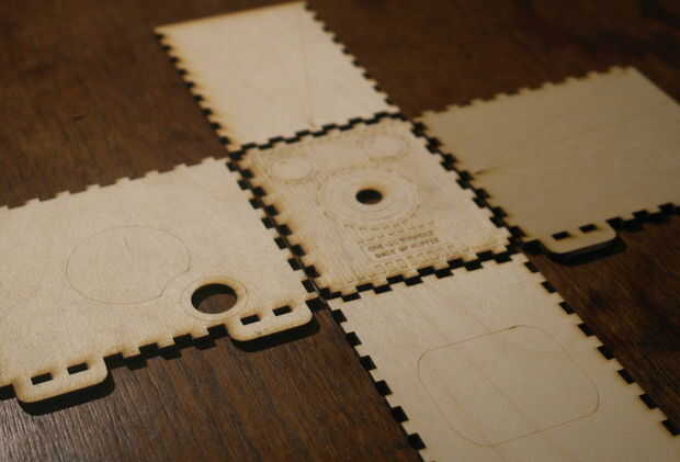 El primer paso es unir las cinco piezas caso principal de la cámara, en el orden indicado en la primera imagen. Al igual que con el sostenedor de la película es importante tomate tu tiempo y conseguir un buen ajuste apretado. Inicio encajando las piezas laterales en la pieza del fondo, luego agregar la parte superior y finalmente el panel frontal.