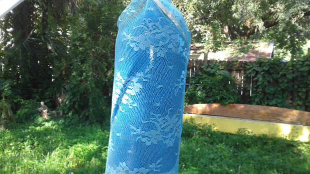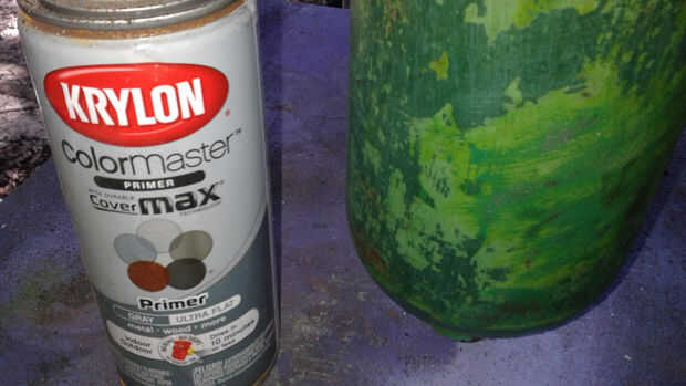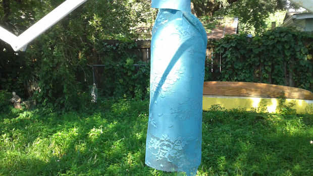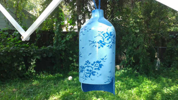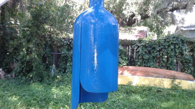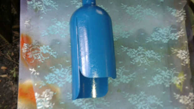 A continuación pinté la campana. Primero dio la parte metálica una capa de imprimación. Cuando se seca que cubrió la campana entera con pintura motor marina del grado. Finalmente, envuelta la campana con el cordón y tiro una capa de luz azul. Cuando se retiró el cordón, se fue el patrón del cordón en la campana.