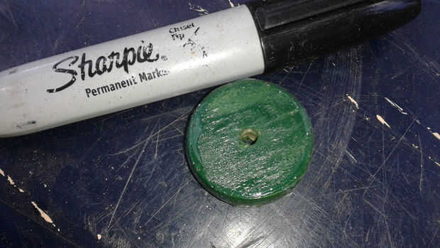 Puesto que la cuerda de colgante original fue cubierta en pintura, hice uno nuevo con una larga cola para unir el clanger bell. El clanger fue un disco redondo de madera cortado con una sierra. Fue pintado alrededor del borde con masilla de silicona para suavizar su impacto con la campana. Até un disco platted a la cola de cuerda, por lo que el viento sería cogerlo y hacer el anillo de la campana. También sirve como asa para anillo de la campana. La colgué en mi porche delantero como mi timbre nuevo.
