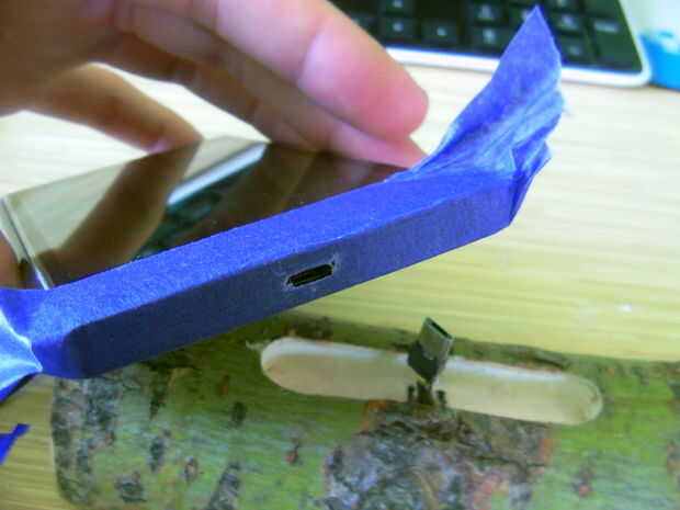El punto no es pegar el teléfono a la base, pero sólo el enchufe del usb micro. Grabado mi teléfono con cinta de pintor azul para asegurarse de que cualquier pegamento dañará mi teléfono. Que poner pegamento en el agujero y coloca sólo teléfono en el dock con el conectador de carga conectada. Lo importante es que tenga que esperar hasta que el pegamento es frío, entonces simplemente retire el teléfono de la base.