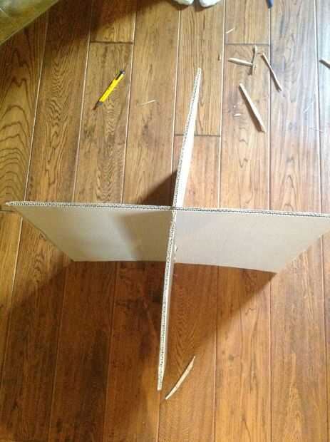 Coloque una pierna en el otro.  Esto crea una estrella de cuatro puntos que dará soporte a la mesa.