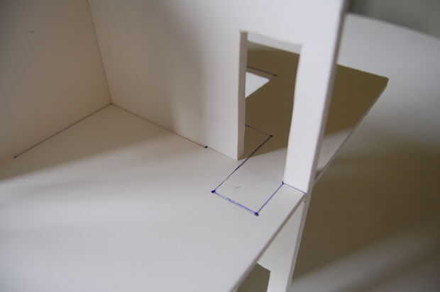 La diapositiva superior de dos plantas en las ranuras de la pared #1 y sus pestañas empuje a través de las puertas y las ranuras de la pared #2